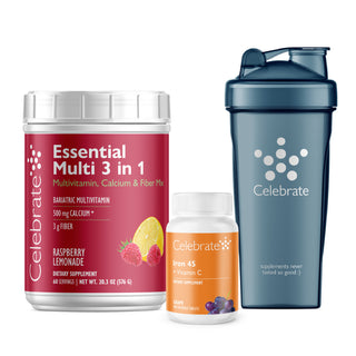 Onnittelut painonpudotusmatkasi alusta! Tämä bariatrinen leikkauksen jälkeinen aloituspakkaus tarjoaa kaikki tarvittavat vitamiinit/mineraalit ja proteiinit hieman pidempään leikkauksen jälkeen; Celebrate Essential Multi 3 in 1 -juomaseoksemme sisältää monipuolisen monivitamiinin, kalsiumsitraatin ja liukoisen kuidun sekä 500 mg antioksidanttiseosta lisättyjen elektrolyyttien kanssa. Tehosekoitinpullomme helpottaa pirtelöiden sekoittamista, sillä pulloissamme on unssimerkinnät sivulla, jotta voit seurata nesteitäsi. Lisäksi 45 mg kalsiumia, jonka voit valita pureskeltavana tai pehmeänä pureskeltavana. Kaikki tämän setin tuotteet ovat saatavilla myös erikseen kyseisen ravintoaineosion alla.