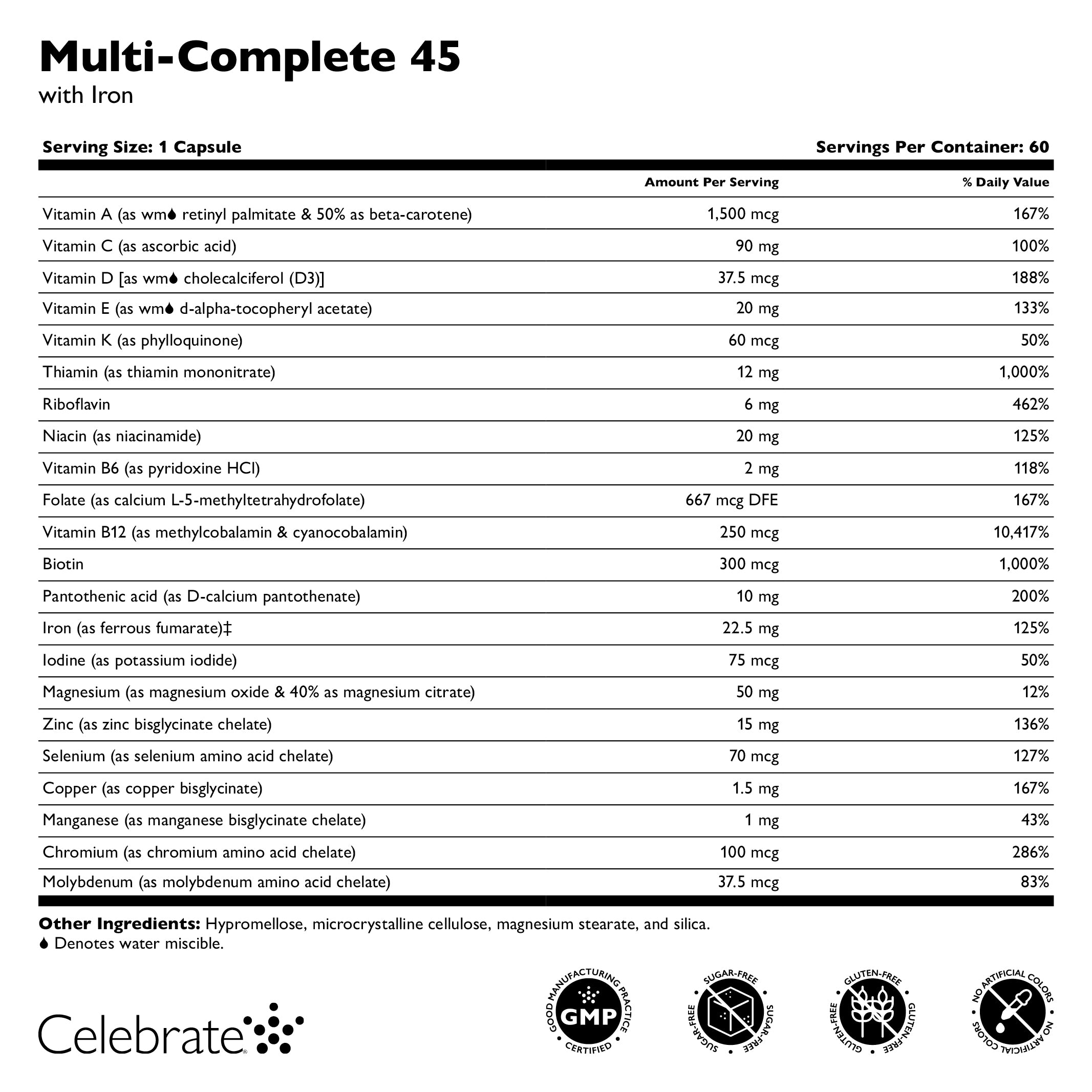 Celebrate Multi-Complete 45 sisältää kaikki vitamiinit ja kivennäisaineet kahdessa päivittäisessä annoksessa, jaettuna annosvaihtoehtona, potilaiden tarvitsee vain lisätä kalsiumia. Tämä vaihtoehto on täydellinen potilaille, jotka ovat herkkiä suuremmille annoksille ja tarvitsevat annosten jakamista paremman sietokyvyn saavuttamiseksi. Tämä bariatrinen monivitamiini täyttää ASMBS:n monivitamiini- ja rautastandardit bariatrialeikkauksen jälkeen. Tämä integroitu kaava tarjoaa maksimaalisen biologisen hyötyosuuden, sillä olemme huolellisesti valinneet jokaisen vitamiini- ja kivennäisaineen muodon parantaaksemme vuorovaikutusta ja imeytymistä. MC-45 on saatavilla kahdessa pureskeltavassa maussa (Metsä Berry ja Watermelon) tai kapselina.